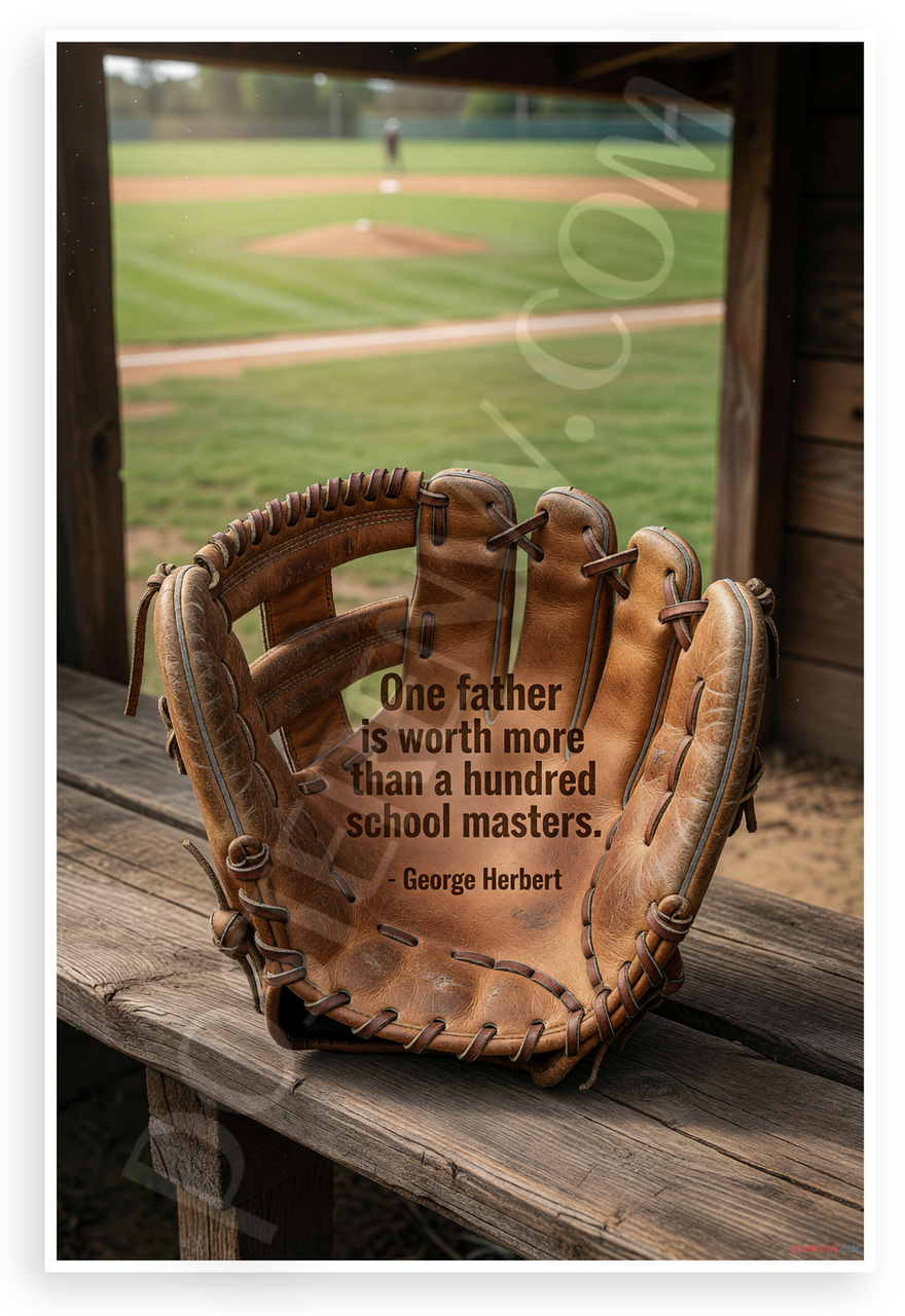 This 12x18 inch poster is printed on premium, durable paper. Proudly Made in the USA by PosterEnvy. The perfect size for any room. PosterEnvy is a family owned business, delivering top-notch posters around the world for over 20 years. Our posters are designed to last — they won't fade or pucker for years of enjoyment. Every poster features crisp, vivid artwork. We are a solar powered company. This inspirational poster showcases George Herbert's quote 'One father is worth more than a hundred school masters' overlaid on a detailed leather baseball glove, with a blurred baseball field and dugout in the background, evoking family bonds and sports nostalgia.