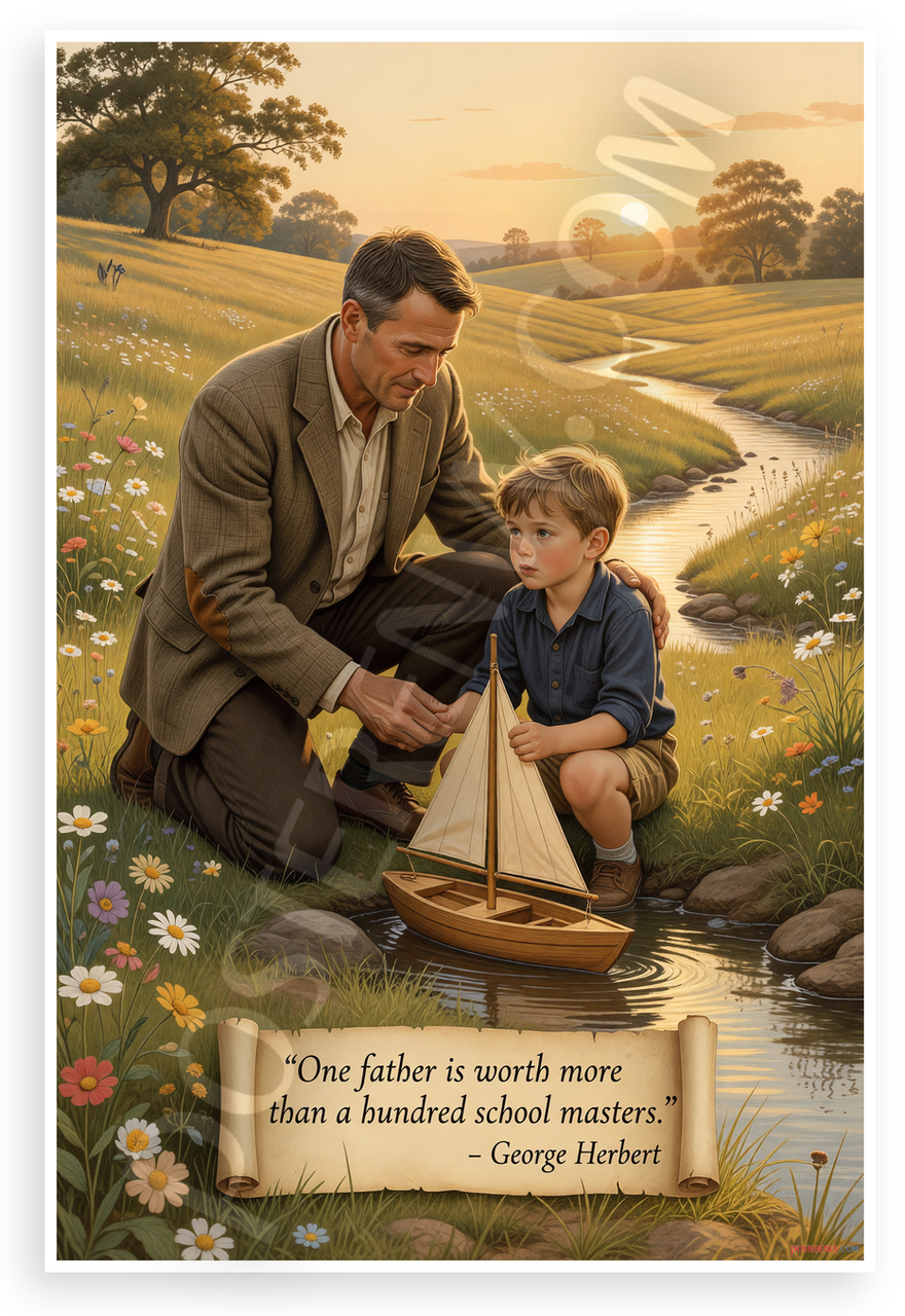 This 12x18 inch poster is printed on premium, durable paper. Proudly Made in the USA by PosterEnvy. The perfect size for any room. PosterEnvy is a family owned business, delivering top-notch posters around the world for over 20 years. Our posters are designed to last — they won't fade or pucker for years of enjoyment. Every poster features crisp, vivid artwork. We are a solar powered company. This vintage-style illustration depicts a tender father-son moment by a serene stream, with the father helping his young boy with a toy sailboat amid golden fields and wildflowers at sunset. The scroll quote by George Herbert celebrates the profound value of fatherly guidance over formal education.