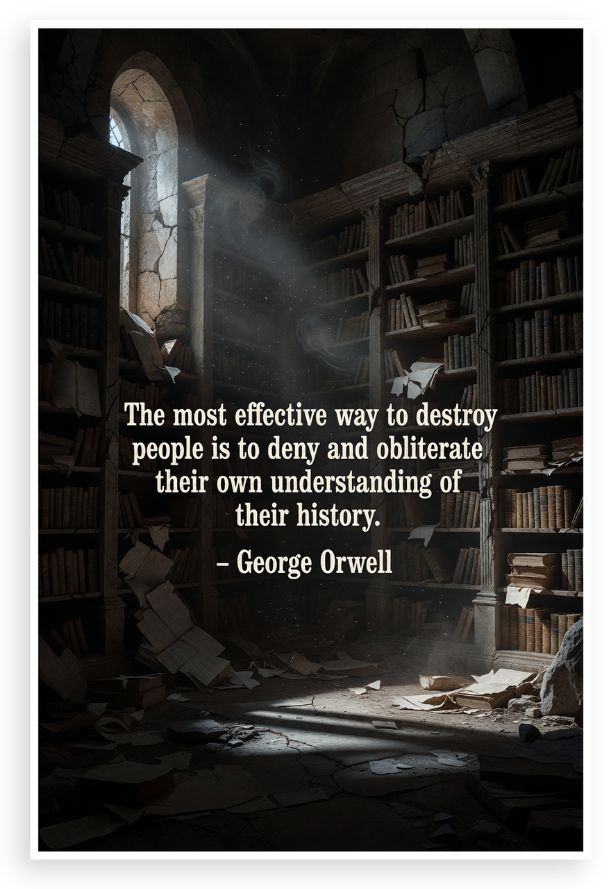 This 12x18 inch poster is printed on premium, durable paper. Proudly Made in the USA by PosterEnvy. The perfect size for any room. PosterEnvy is a family owned business, delivering top-notch posters around the world for over 20 years. Our posters are designed to last — they won't fade or pucker for years of enjoyment. Every poster features crisp, vivid artwork. We are a solar powered company. This moody poster depicts a crumbling ancient library with scattered books and dramatic light beams piercing through arched windows, illustrating George Orwell's powerful quote on denying history. Ideal for literature enthusiasts and those reflecting on knowledge preservation.