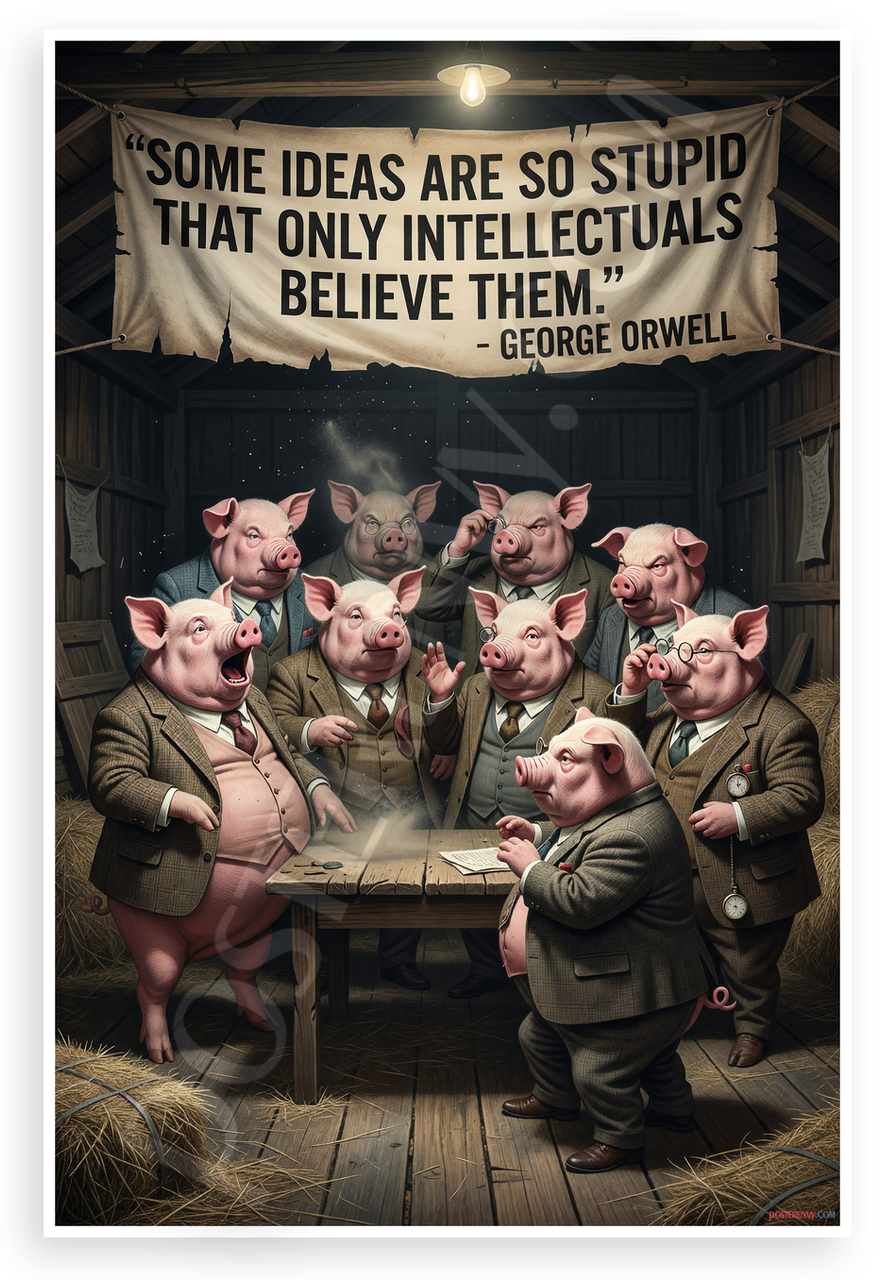 - Satirical Animal Farm Scene: Pigs in suits debating in dimly lit barn with Orwell quote banner creates ironic humorous mood ideal for office library man cave or study