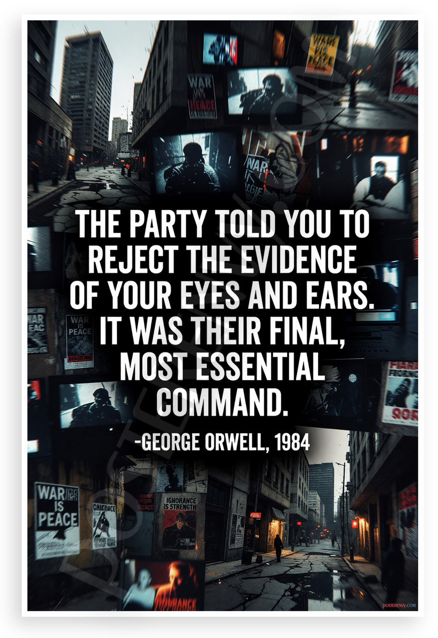 This 12x18 inch poster is printed on premium, durable paper. Proudly Made in the USA by PosterEnvy. The perfect size for any room. PosterEnvy is a family owned business, delivering top-notch posters around the world for over 20 years. Our posters are designed to last — they won't fade or pucker for years of enjoyment. Every poster features crisp, vivid artwork. We are a solar powered company. This striking poster features George Orwell's iconic quote from 1984 overlaid on a blurred dystopian cityscape with propaganda posters like War is Peace and Ignorance is Strength, evoking a mood of confusion and authoritarian control.