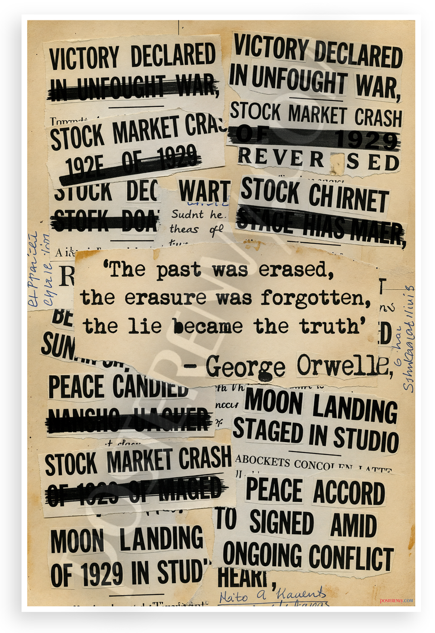 This 12x18 inch poster is printed on premium, durable paper. Proudly Made in the USA by PosterEnvy. The perfect size for any room. PosterEnvy is a family owned business, delivering top-notch posters around the world for over 20 years. Our posters are designed to last — they won't fade or pucker for years of enjoyment. Every poster features crisp, vivid artwork. We are a solar powered company. This provocative collage poster features manipulated vintage newspaper headlines on rewritten history, stock market crashes, moon landing conspiracies, and unfought wars, prominently displaying George Orwell's chilling quote 'The past was erased, the erasure was forgotten, the lie became the truth.' Ideal for dystopian literature fans and thought-provoking decor.