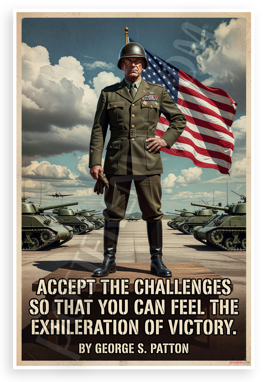 - Premium Print: This PosterEnvy 12x18 inch poster is printed on Durable, Heavy Duty Paper, Designed to last many years. Features George S. Patton quote on challenges and victory with military tanks planes flag