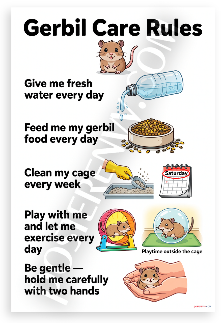 - Cute Gerbil Care Guide: Vibrant cartoon illustrations show fresh water, feeding, cage cleaning, playtime exercise, gentle holding; perfect for kids rooms, classrooms, vet offices
