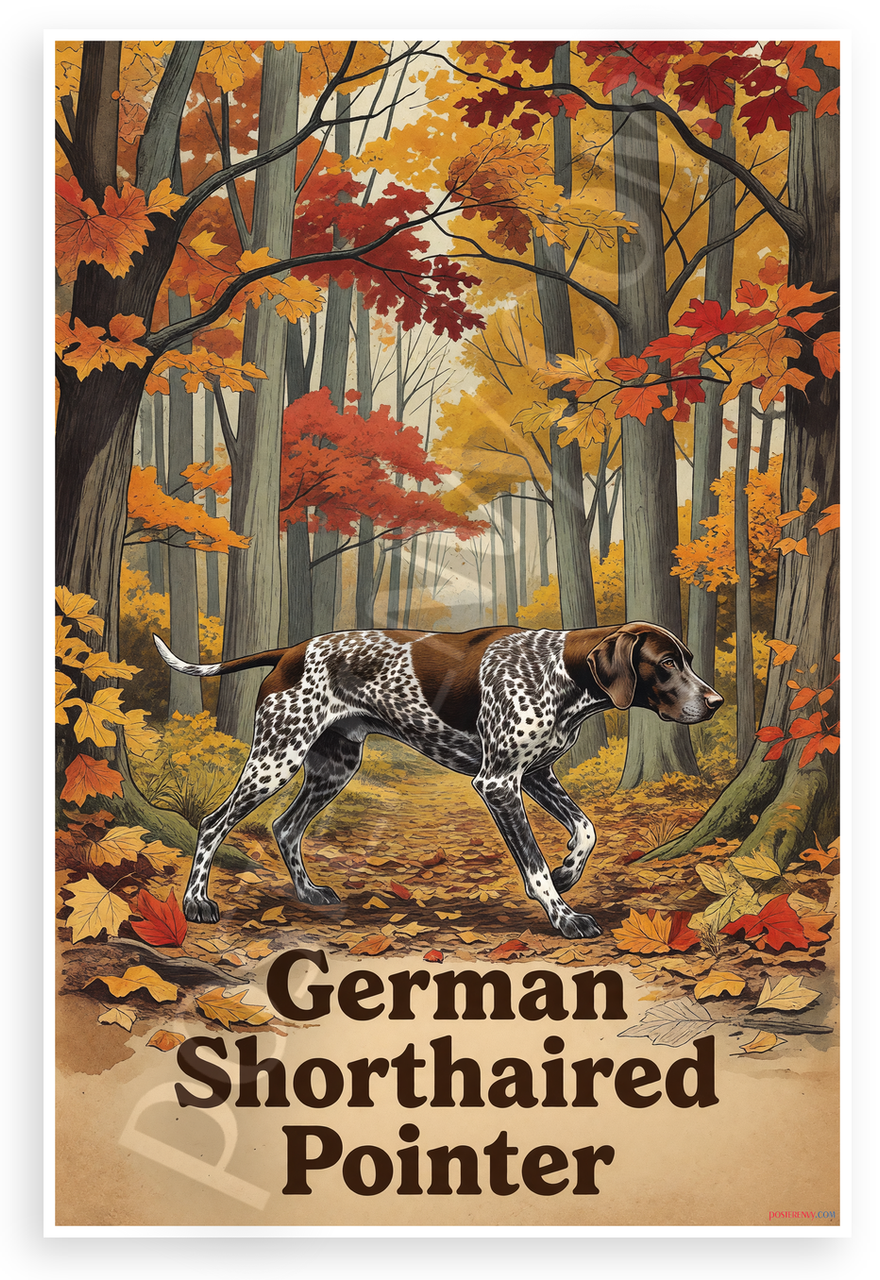 - Premium Print: This PosterEnvy 12x18 inch poster is printed on Durable, Heavy Duty Paper, Designed to last many years. Features German Shorthaired Pointer in autumn woods hunting scene with vintage illustration style
