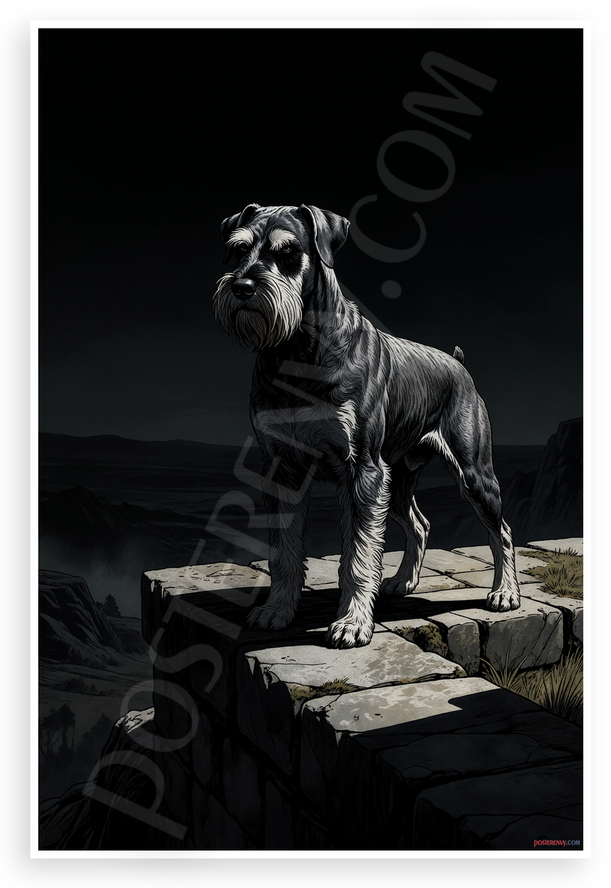 This 12x18 inch poster is printed on premium, durable paper. Proudly Made in the USA by PosterEnvy. The perfect size for any room. PosterEnvy is a family owned business, delivering top-notch posters around the world for over 20 years. Our posters are designed to last — they won't fade or pucker for years of enjoyment. Every poster features crisp, vivid artwork. We are a solar powered company. This striking illustration captures a Giant Schnauzer standing watchfully on a stone ledge overlooking misty cliffs, with bold shadows and high contrast evoking protection and resilience. The dramatic black and white style adds a sense of steadfast guardianship to any space.
