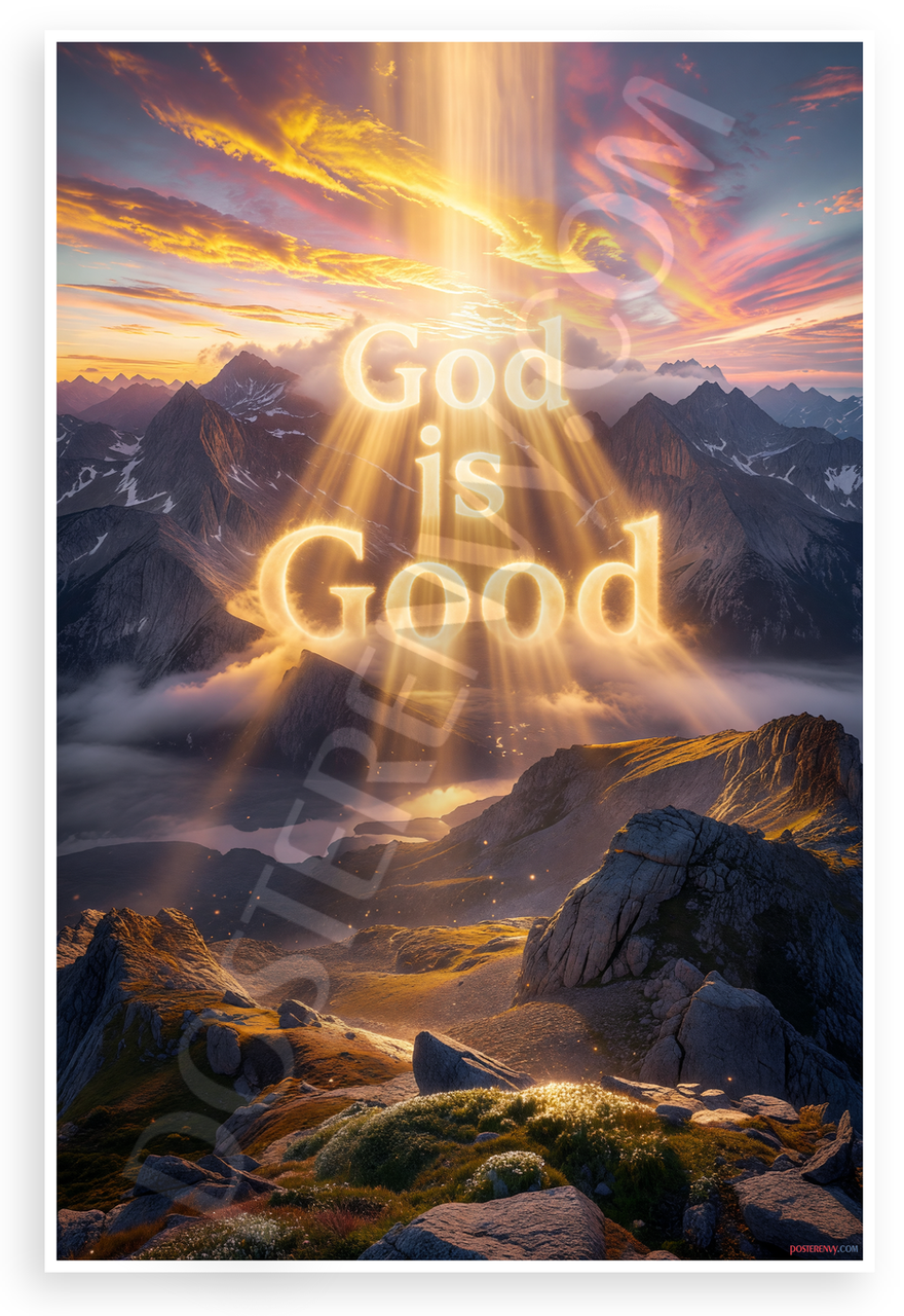 This 12x18 inch poster is printed on premium, durable paper. Proudly Made in the USA by PosterEnvy. The perfect size for any room. PosterEnvy is a family owned business, delivering top-notch posters around the world for over 20 years. Our posters are designed to last — they won't fade or pucker for years of enjoyment. Every poster features crisp, vivid artwork. We are a solar powered company. Featuring the uplifting message God is Good over a majestic mountain landscape with glowing rays of light breaking through dramatic clouds at sunset, evoking faith and divine beauty. Ideal for adding spiritual inspiration to your space.