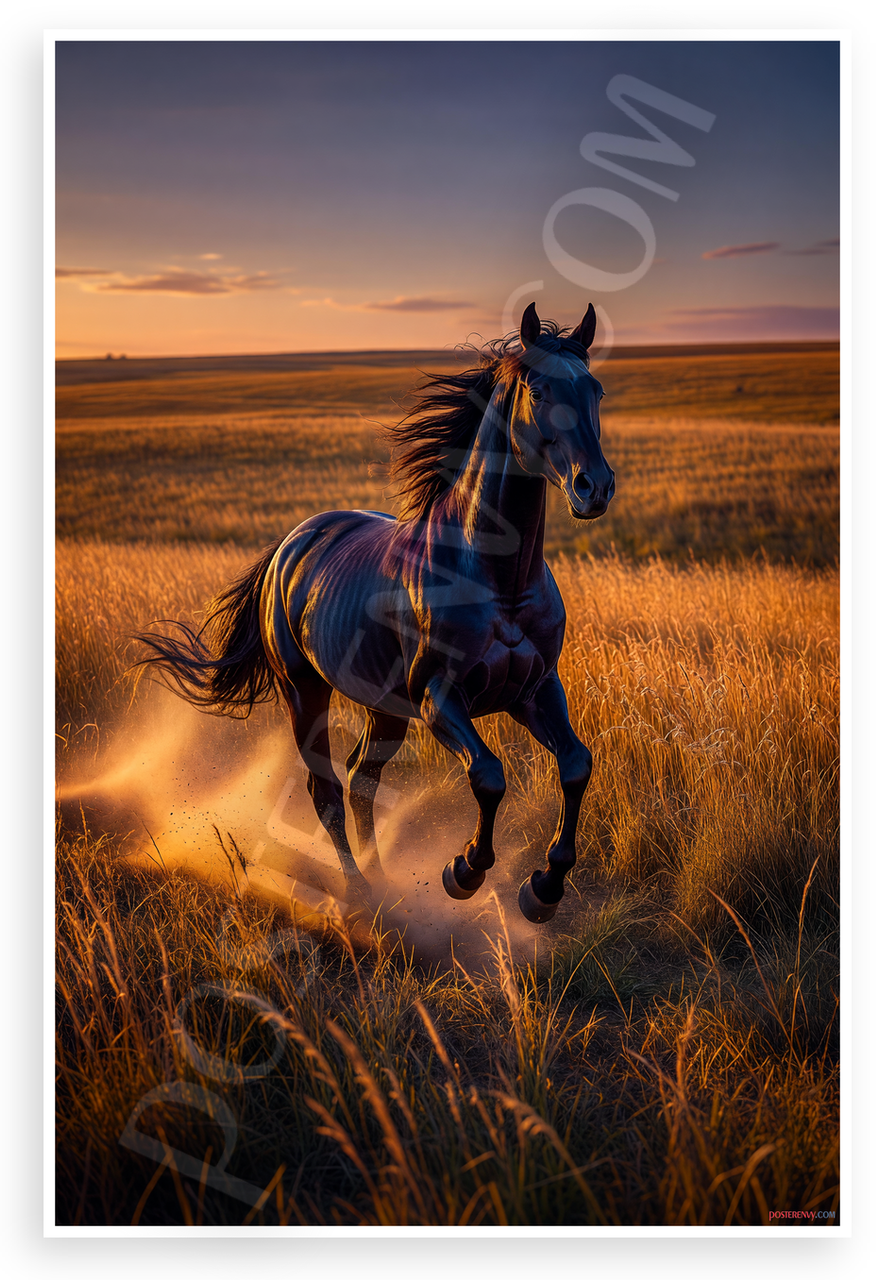 This 12x18 inch poster is printed on premium, durable paper. Proudly Made in the USA by PosterEnvy. The perfect size for any room. PosterEnvy is a family owned business, delivering top-notch posters around the world for over 20 years. Our posters are designed to last — they won't fade or pucker for years of enjoyment. Every poster features crisp, vivid artwork. We are a solar powered company. This stunning wildlife poster captures a graceful black horse galloping freely through golden grasses at dusk, with dramatic lighting and an energetic, vibrant mood. Ideal for evoking a sense of freedom and nature's beauty.