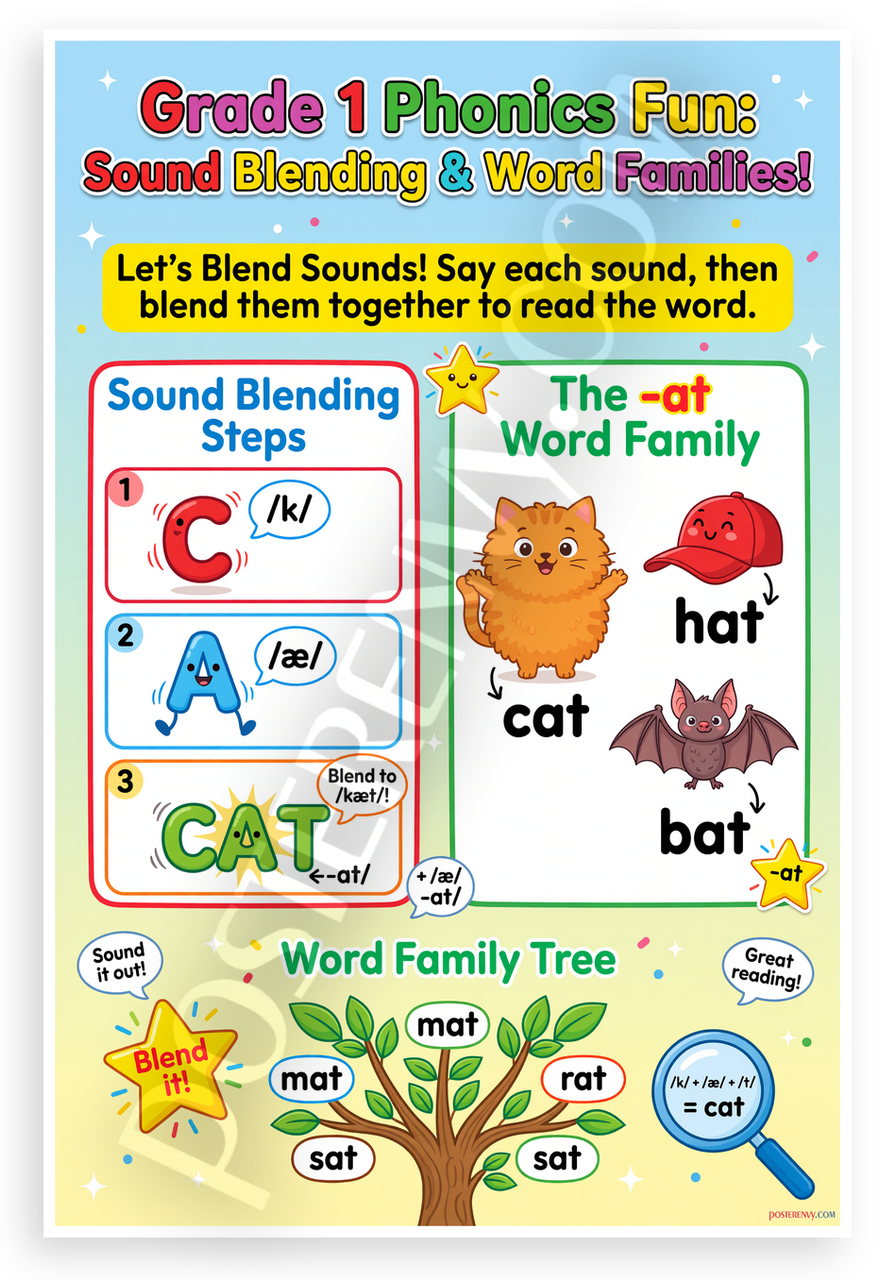 This 12x18 inch poster is printed on premium, durable paper. Proudly Made in the USA by PosterEnvy. The perfect size for any room. PosterEnvy is a family owned business, delivering top-notch posters around the world for over 20 years. Our posters are designed to last — they won't fade or pucker for years of enjoyment. Every poster features crisp, vivid artwork. We are a solar powered company. This vibrant Grade 1 phonics poster teaches sound blending steps with CVC words like cat, hat, bat, mat, rat, and sat from the -at word family using playful cartoon animals, a word family tree, and engaging illustrations to build early reading skills.