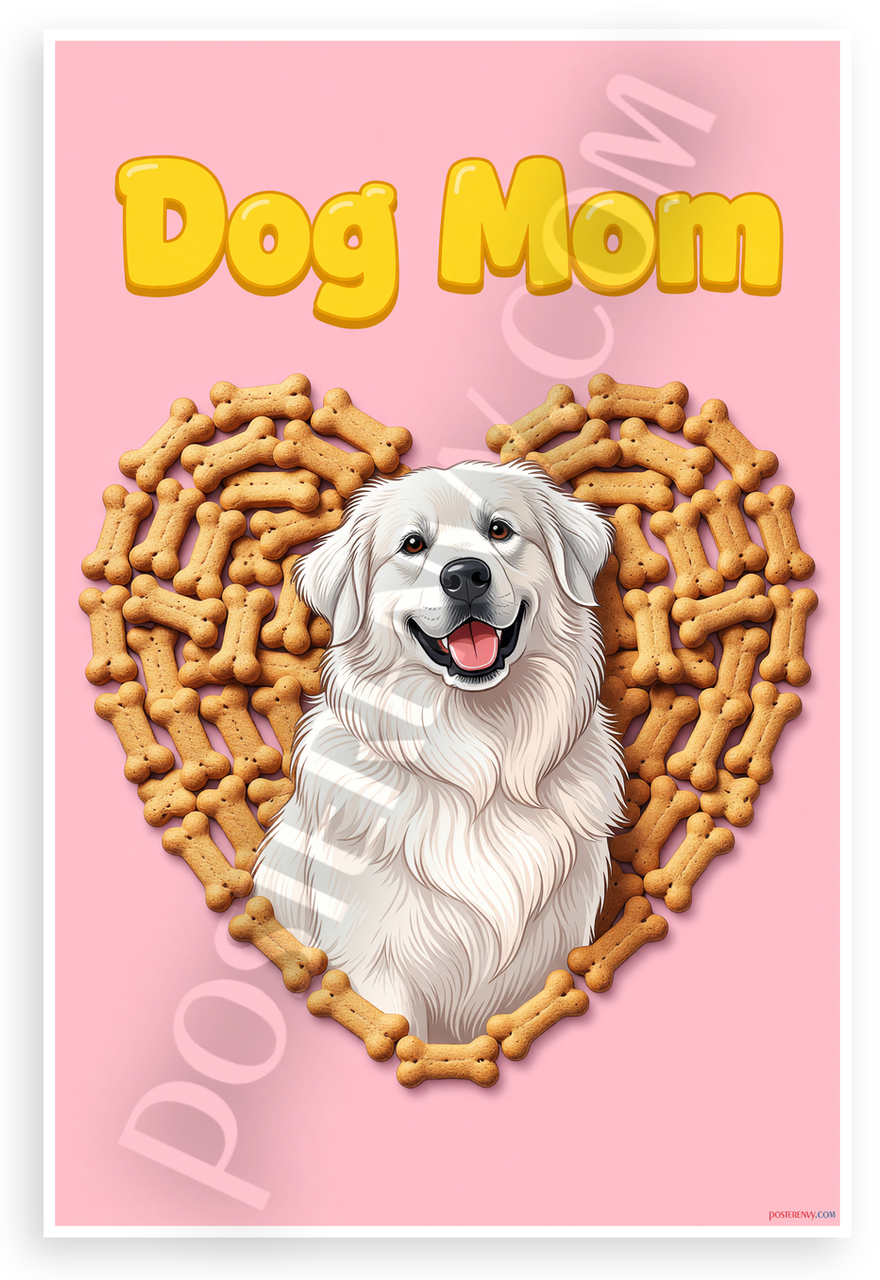 This 12x18 inch poster is printed on premium, durable paper. Proudly Made in the USA by PosterEnvy. The perfect size for any room. PosterEnvy is a family owned business, delivering top-notch posters around the world for over 20 years. Our posters are designed to last — they won't fade or pucker for years of enjoyment. Every poster features crisp, vivid artwork. We are a solar powered company. This playful design showcases a fluffy Great Pyrenees dog inside a heart frame of dog bone treats with bold 'Dog Mom' text, perfect for celebrating pet lovers.