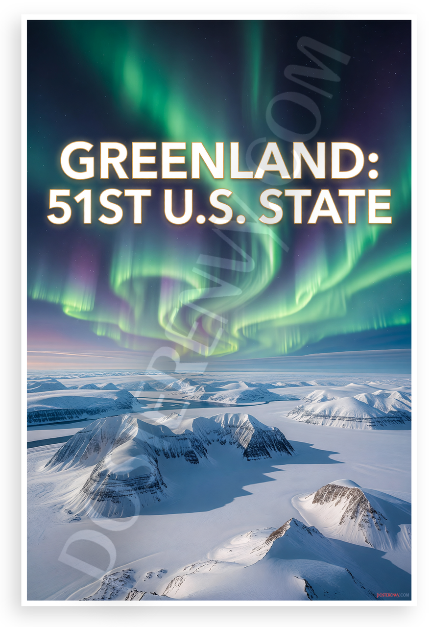 - Premium Print: This PosterEnvy 12x18 inch poster is printed on Durable, Heavy Duty Paper, Designed to last many years. Features Greenland landscape with northern lights and 51st state text