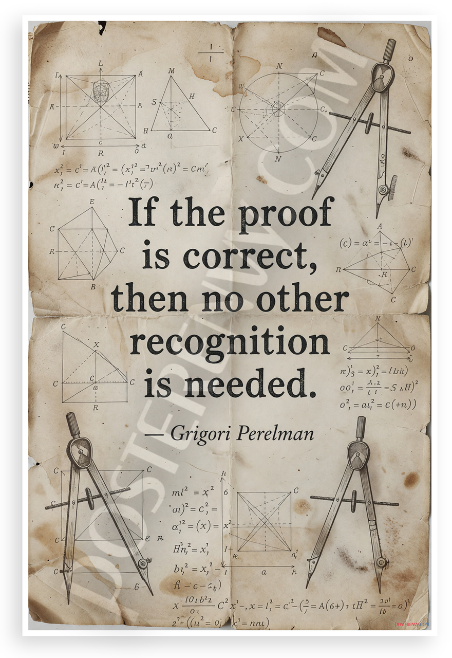 - Vintage Math Design: Evokes scholarly elegance with aged paper texture, intricate geometry sketches, and Perelman quote on proof; ideal for classrooms, studies, offices