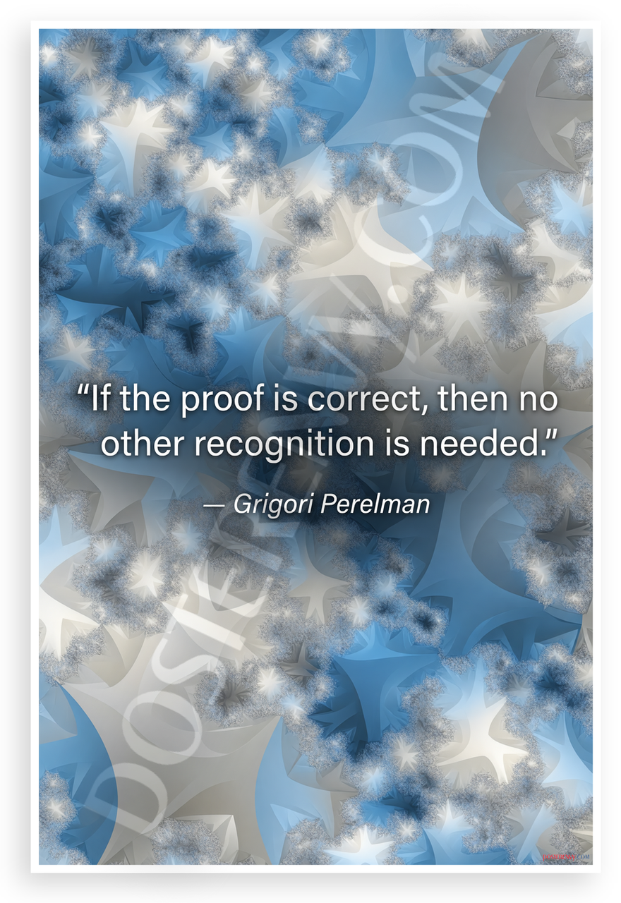- Intellectual Fractal Design: Dynamic interlocking mathematical fractals in muted blues and whites frame Grigori Perelman's quote on proof and recognition. Creates a thoughtful mood for study spaces, offices, or labs