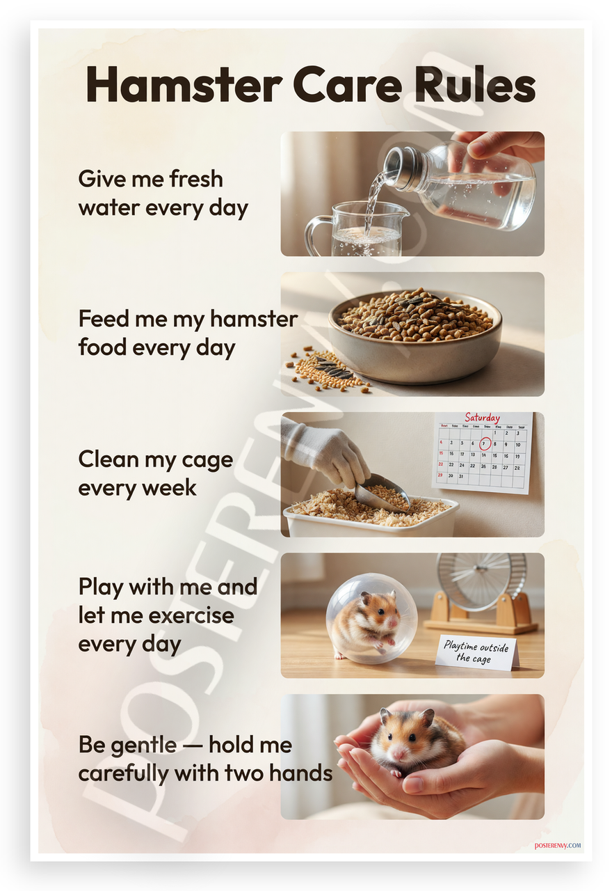 - Premium Print: This PosterEnvy 12x18 inch poster is printed on Durable, Heavy Duty Paper, Designed to last many years featuring hamster care rules, fresh water, food pellets, cage cleaning, exercise and gentle handling