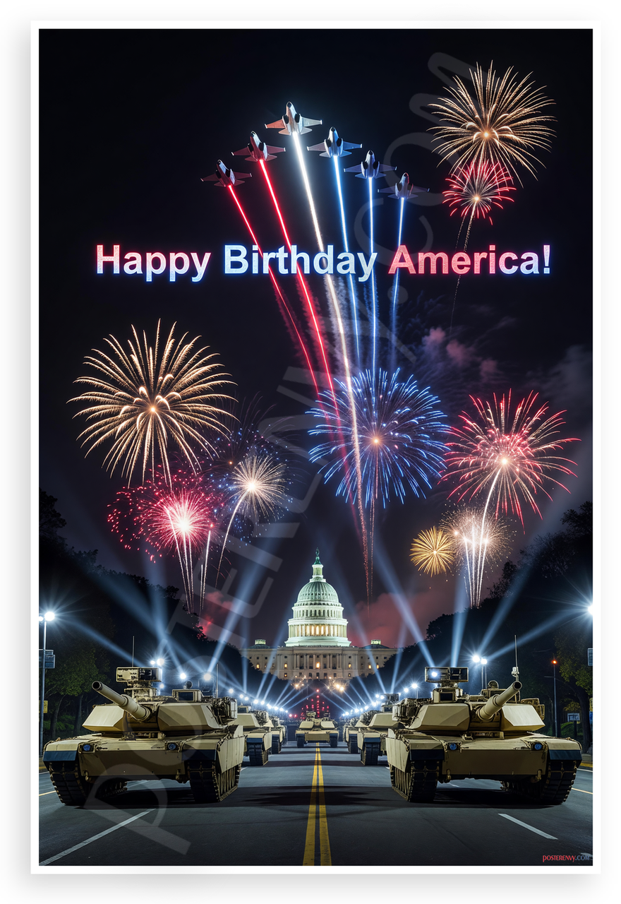 - Dramatic Patriotic Scene: Nighttime Washington DC spectacle with exploding fireworks, F-35 jets red white blue contrails, tanks parade before Capitol, bold text creates proud exhilarating mood ideal for man cave garage office