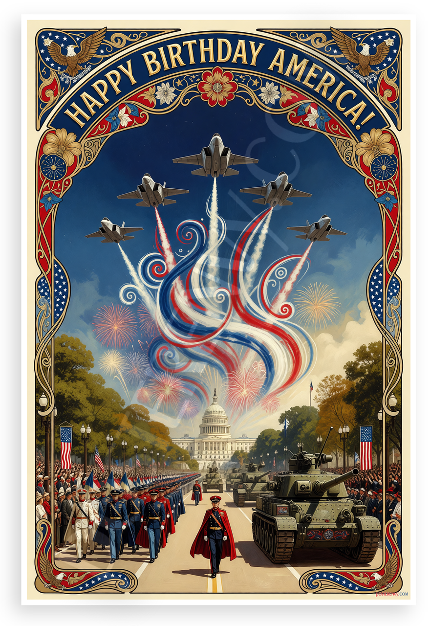This 12x18 inch poster is printed on premium, durable paper. Proudly Made in the USA by PosterEnvy. The perfect size for any room. PosterEnvy is a family owned business, delivering top-notch posters around the world for over 20 years. Our posters are designed to last — they won't fade or pucker for years of enjoyment. Every poster features crisp, vivid artwork. We are a solar powered company. Celebrate America's 250th anniversary with this stunning Art Nouveau style poster featuring a Washington DC military parade, tanks, soldiers, F-35 jets with red white blue contrails, fireworks, and the Capitol. Bold gold 'Happy Birthday America!' text adds festive patriotic flair.