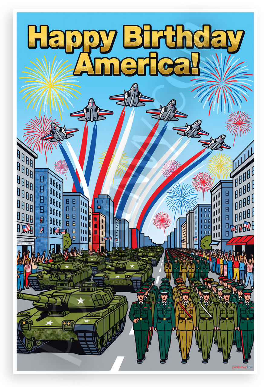 This 12x18 inch poster is printed on premium, durable paper. Proudly Made in the USA by PosterEnvy. The perfect size for any room. PosterEnvy is a family owned business, delivering top-notch posters around the world for over 20 years. Our posters are designed to last — they won't fade or pucker for years of enjoyment. Every poster features crisp, vivid artwork. We are a solar powered company. Celebrate America's birthday with this vibrant pop art depiction of a grand military parade in Washington DC, featuring tanks, marching soldiers, F-35 jets with red white and blue contrails, fireworks exploding overhead, and bold gold 'Happy Birthday America!' text.