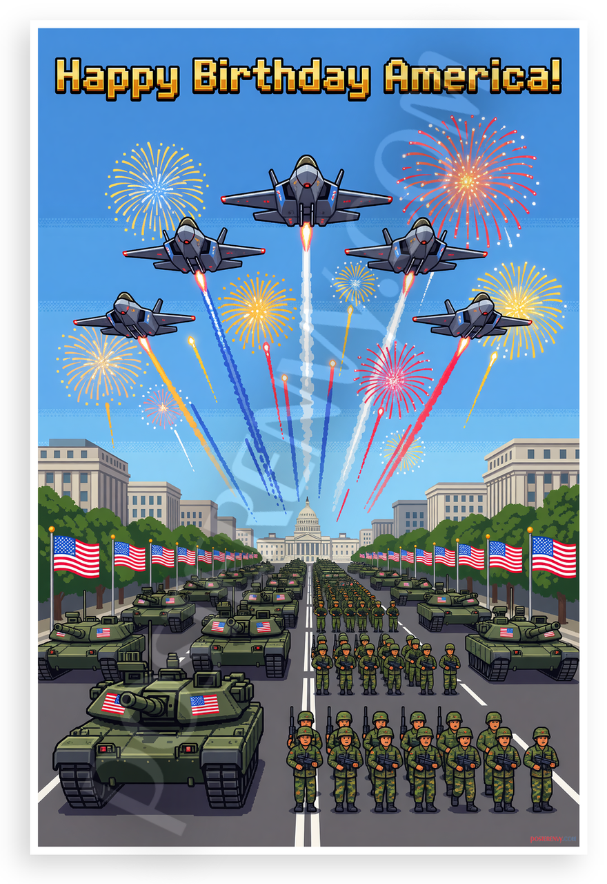 - Patriotic Pixel Art Scene: Vibrant chibi-style illustration of Washington DC parade with jets flying overhead, tanks rolling past Capitol, flags waving, and explosive fireworks for an energetic Independence Day mood. Ideal for man caves, garages, home offices, or game rooms