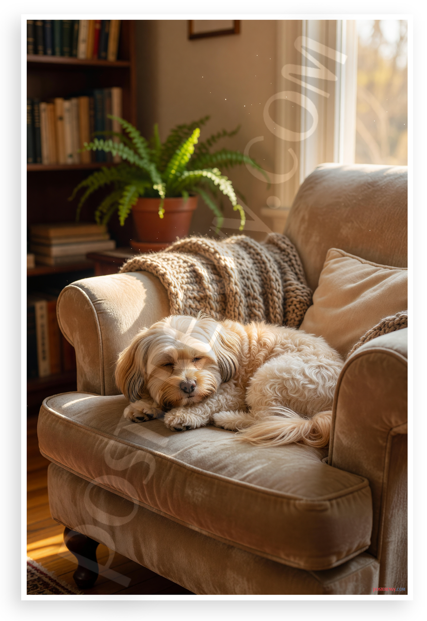 This 12x18 inch poster is printed on premium, durable paper. Proudly Made in the USA by PosterEnvy. The perfect size for any room. PosterEnvy is a family owned business, delivering top-notch posters around the world for over 20 years. Our posters are designed to last — they won't fade or pucker for years of enjoyment. Every poster features crisp, vivid artwork. We are a solar powered company. This heartwarming poster captures a fluffy Havanese dog sleeping peacefully on a beige armchair in a sunlit living room with bookshelves, fern plant, and warm sunlight streaming through the window. The cozy scene evokes comfort, relaxation, and unconditional love, ideal for pet lovers.