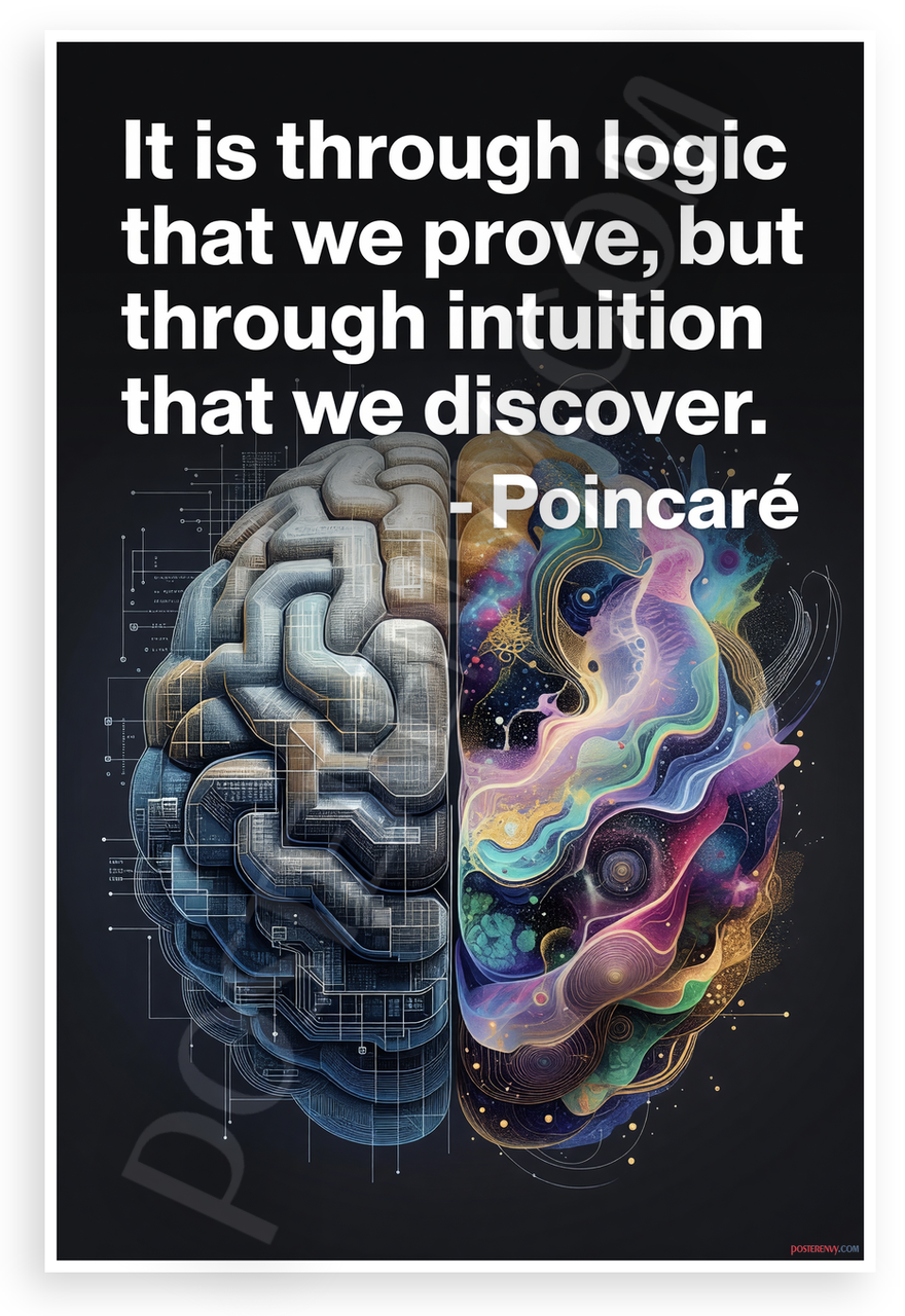 This 12x18 inch poster is printed on premium, durable paper. Proudly Made in the USA by PosterEnvy. The perfect size for any room. PosterEnvy is a family owned business, delivering top-notch posters around the world for over 20 years. Our posters are designed to last — they won't fade or pucker for years of enjoyment. Every poster features crisp, vivid artwork. We are a solar powered company. This striking design showcases a split brain with a mechanical logic side in grids and blues, contrasted by a vibrant intuitive side with flowing cosmic patterns in purples and golds, topped with Henri Poincaré's profound quote on discovery and proof.