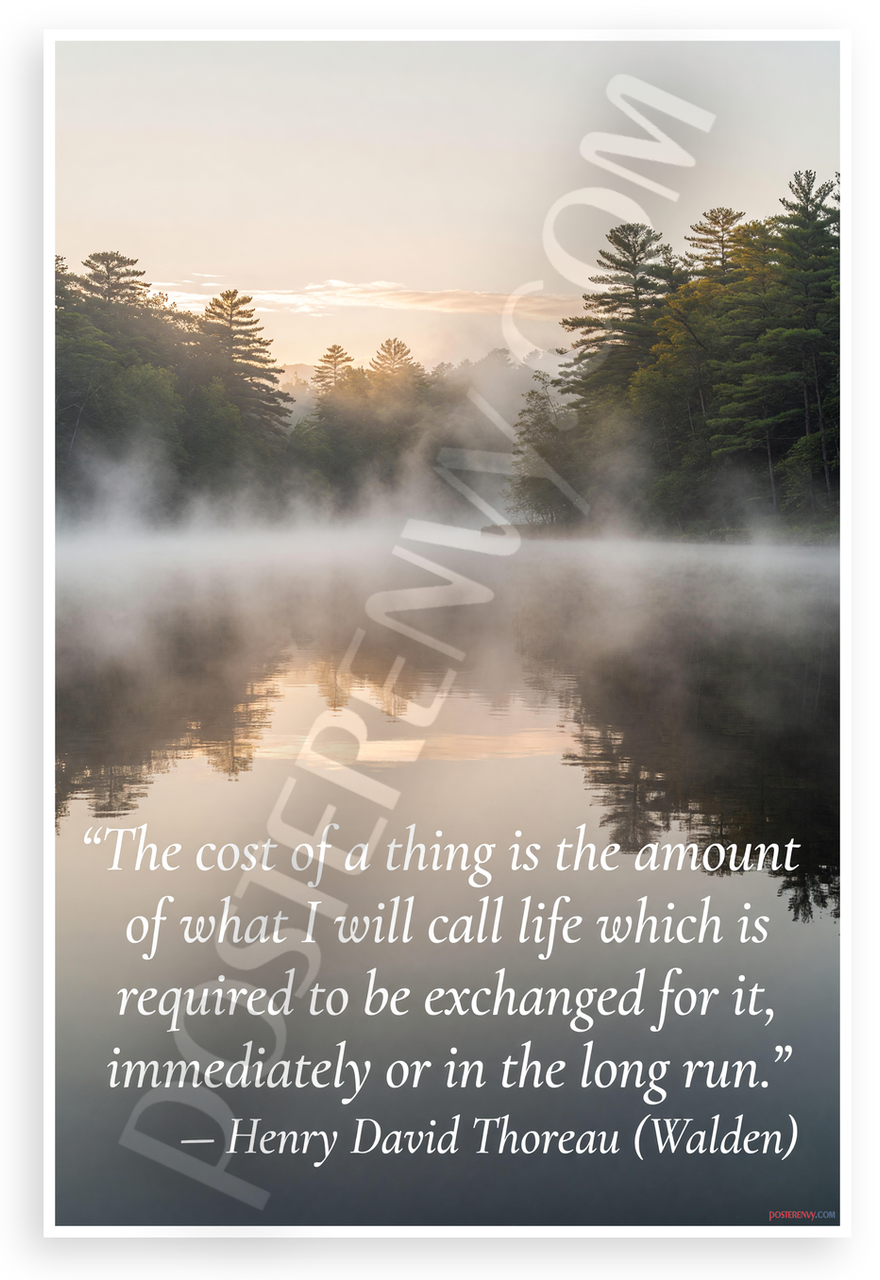 This 12x18 inch poster is printed on premium, durable paper. Proudly Made in the USA by PosterEnvy. The perfect size for any room. PosterEnvy is a family owned business, delivering top-notch posters around the world for over 20 years. Our posters are designed to last — they won't fade or pucker for years of enjoyment. Every poster features crisp, vivid artwork. We are a solar powered company. This serene Walden Pond landscape captures misty dawn light over reflective waters surrounded by pine trees, overlaid with Henry David Thoreau's profound quote from Walden on the true cost of life. Ideal for inspiring reflection and simplicity.