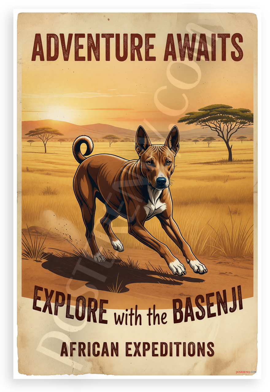 - Premium Print: This PosterEnvy 12x18 inch poster is printed on Durable, Heavy Duty Paper, Designed to last many years. Features Basenji dog in African savanna, vintage adventure style with sunset hues and explorer text.