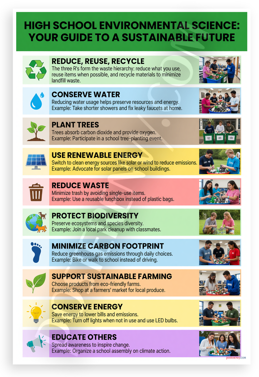 - Premium Print: This PosterEnvy 12x18 inch poster is printed on Durable, Heavy Duty Paper, Designed to last many years. Features 10 high school environmental science tips on sustainability like reduce reuse recycle, conserve water, plant trees