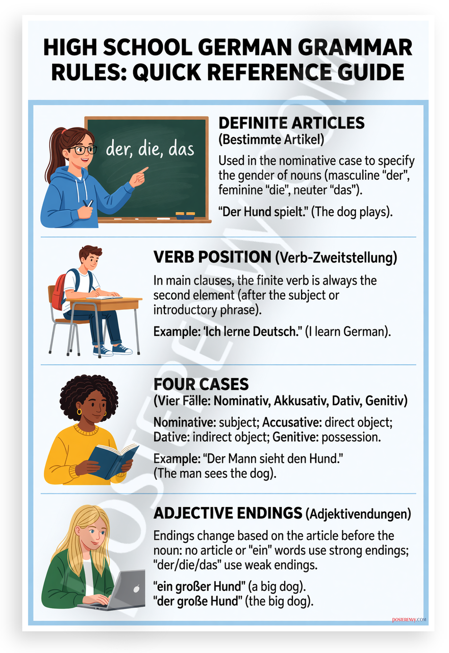 - Premium Print: This PosterEnvy 12x18 inch poster is printed on Durable, Heavy Duty Paper, Designed to last many years. Features high school German grammar rules like definite articles der die das, verb position, cases, adjective endings with examples