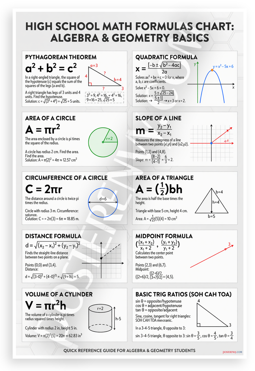 - Premium Print: This PosterEnvy 12x18 inch poster is printed on Durable, Heavy Duty Paper, Designed to last many years. Features Pythagorean Theorem, Quadratic Formula, Circle Area, Slope, Distance Formula, and geometry basics for high school students