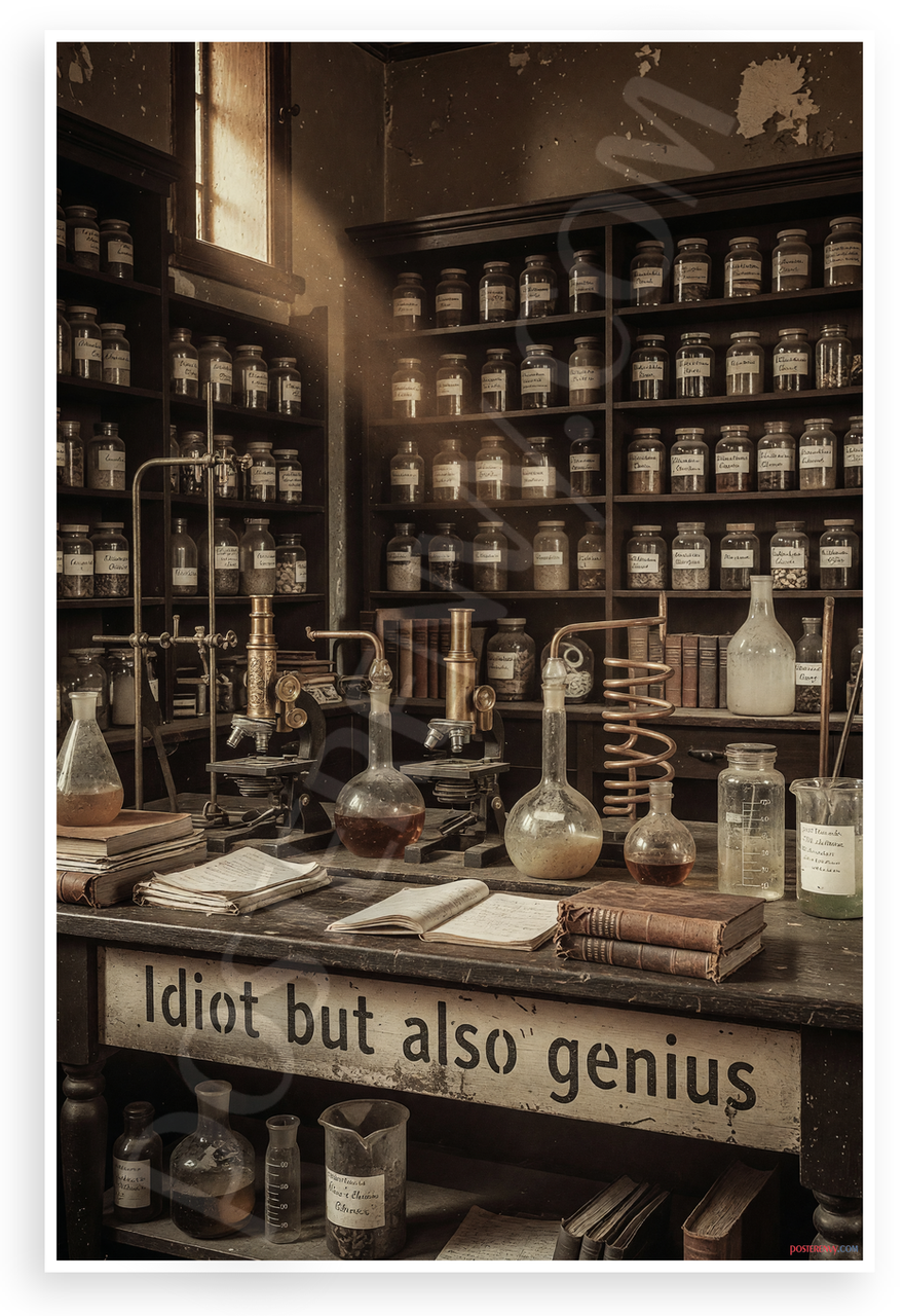 - Premium Print: This PosterEnvy 12x18 inch poster is printed on Durable, Heavy Duty Paper, Designed to last many years. Features vintage apothecary lab with 'Idiot but also genius' text and scientific glassware