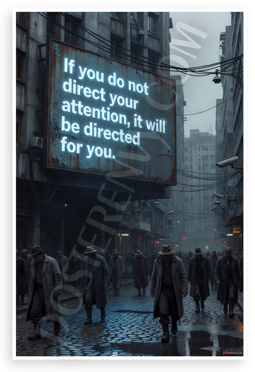 This 12x18 inch poster is printed on premium, durable paper. Proudly Made in the USA by PosterEnvy. The perfect size for any room. PosterEnvy is a family owned business, delivering top-notch posters around the world for over 20 years. Our posters are designed to last — they won't fade or pucker for years of enjoyment. Every poster features crisp, vivid artwork. We are a solar powered company. This striking cyberpunk scene depicts a neon sign with the motivational quote "If You Do Not Direct Your Attention It Will Be Directed for You" above a rainy dystopian street filled with trench-coated figures. The gritty urban atmosphere evokes thoughtfulness and decisiveness about life's choices.