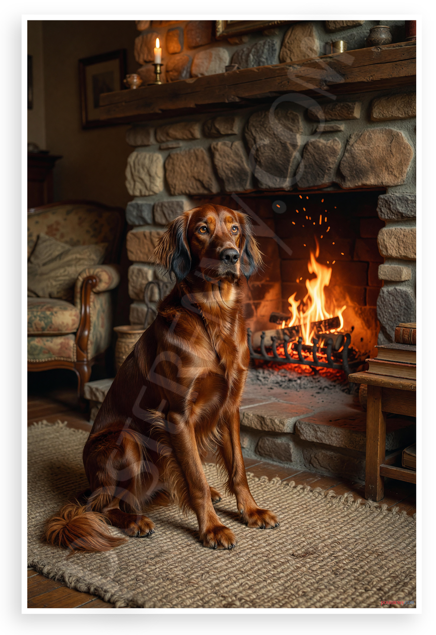 - Cozy Dog Portrait: Warm painterly style depicts an Irish Setter sitting alert by a stone fireplace with glowing flames, antique furniture, and soft rug. Creates comforting ambiance for living rooms, dens, or pet-themed spaces