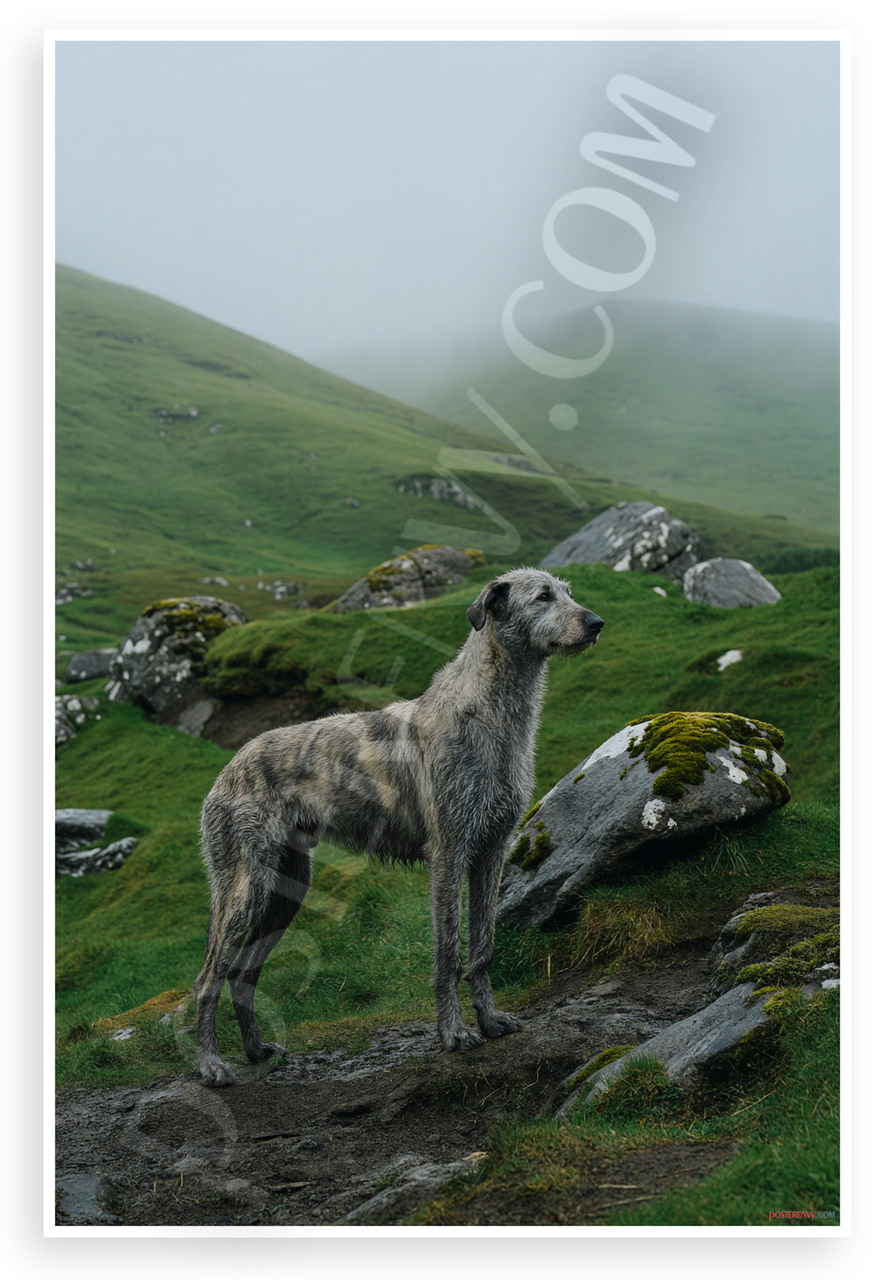 - Majestic Dog Landscape: A powerful Irish Wolfhound stands amid foggy green hills, rocks, and moss in a serene, noble mood. Perfect for living rooms, dens, or pet-themed spaces