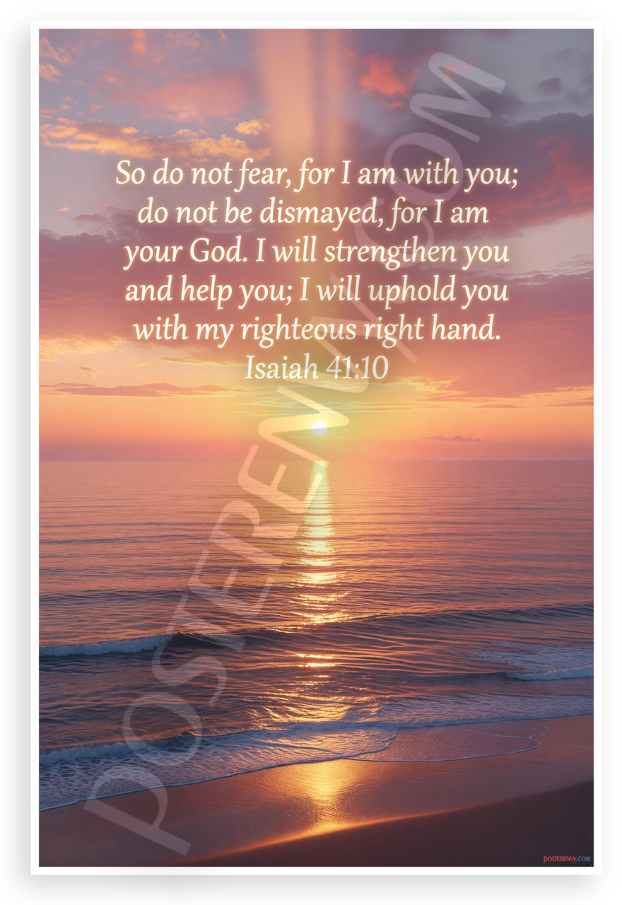 - Premium Print: This PosterEnvy 12x18 inch poster is printed on Durable, Heavy Duty Paper, Designed to last many years featuring Isaiah 41:10 Bible verse with serene ocean sunset and waves