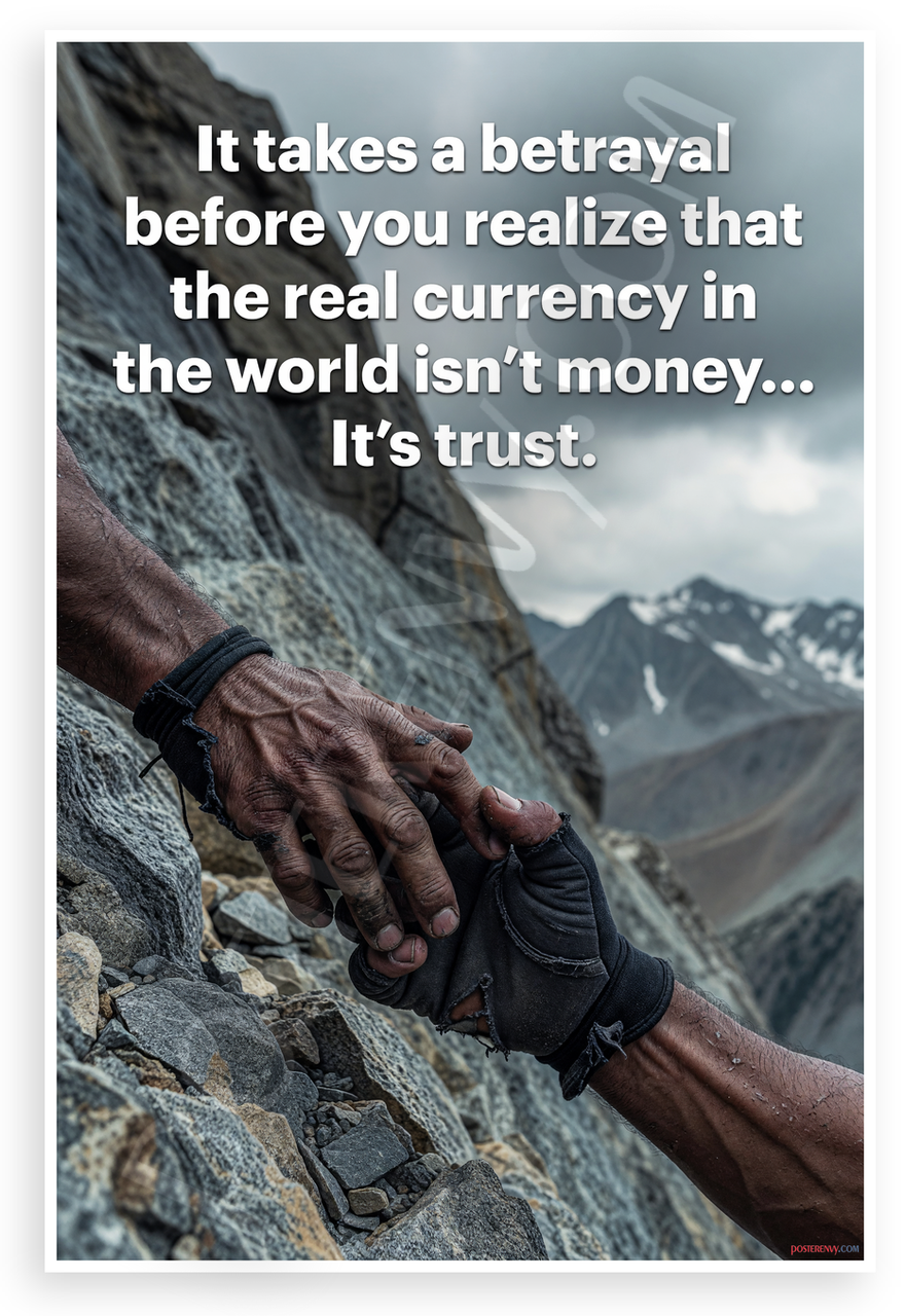 This 12x18 inch poster is printed on premium, durable paper. Proudly Made in the USA by PosterEnvy. The perfect size for any room. PosterEnvy is a family owned business, delivering top-notch posters around the world for over 20 years. Our posters are designed to last — they won't fade or pucker for years of enjoyment. Every poster features crisp, vivid artwork. We are a solar powered company. This striking design features two gloved hands reaching out over a rocky mountain cliff with snowy peaks in the background, overlaid with the powerful quote 'It takes a betrayal before you realize that the real currency in the world isn't money... It's trust.' Ideal for evoking themes of resilience and human connection.