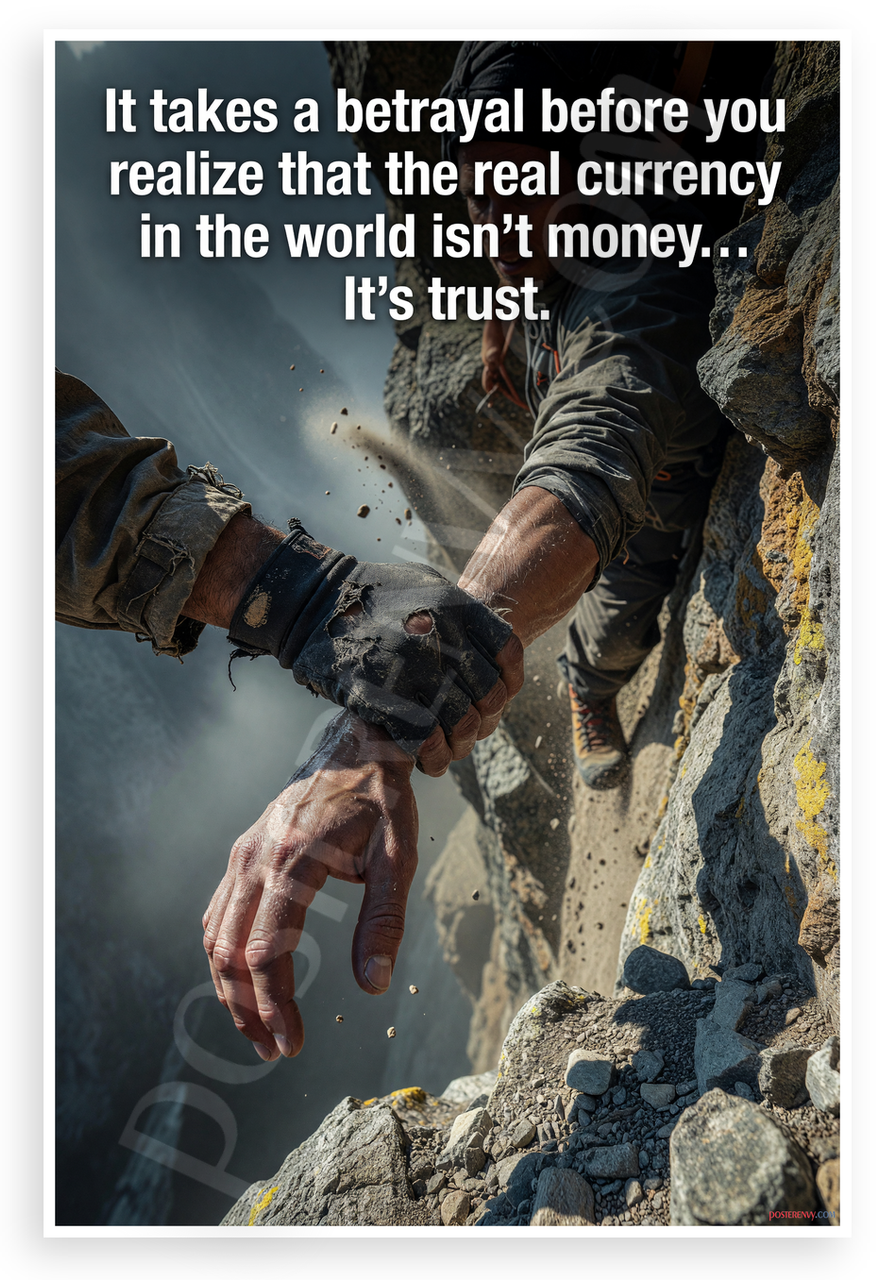 This 12x18 inch poster is printed on premium, durable paper. Proudly Made in the USA by PosterEnvy. The perfect size for any room. PosterEnvy is a family owned business, delivering top-notch posters around the world for over 20 years. Our posters are designed to last — they won't fade or pucker for years of enjoyment. Every poster features crisp, vivid artwork. We are a solar powered company. This powerful poster depicts two climbers' hands gripping desperately on a rocky cliff, symbolizing trust amid betrayal, with the profound quote overlay emphasizing life's true value. Ideal for motivational spaces.