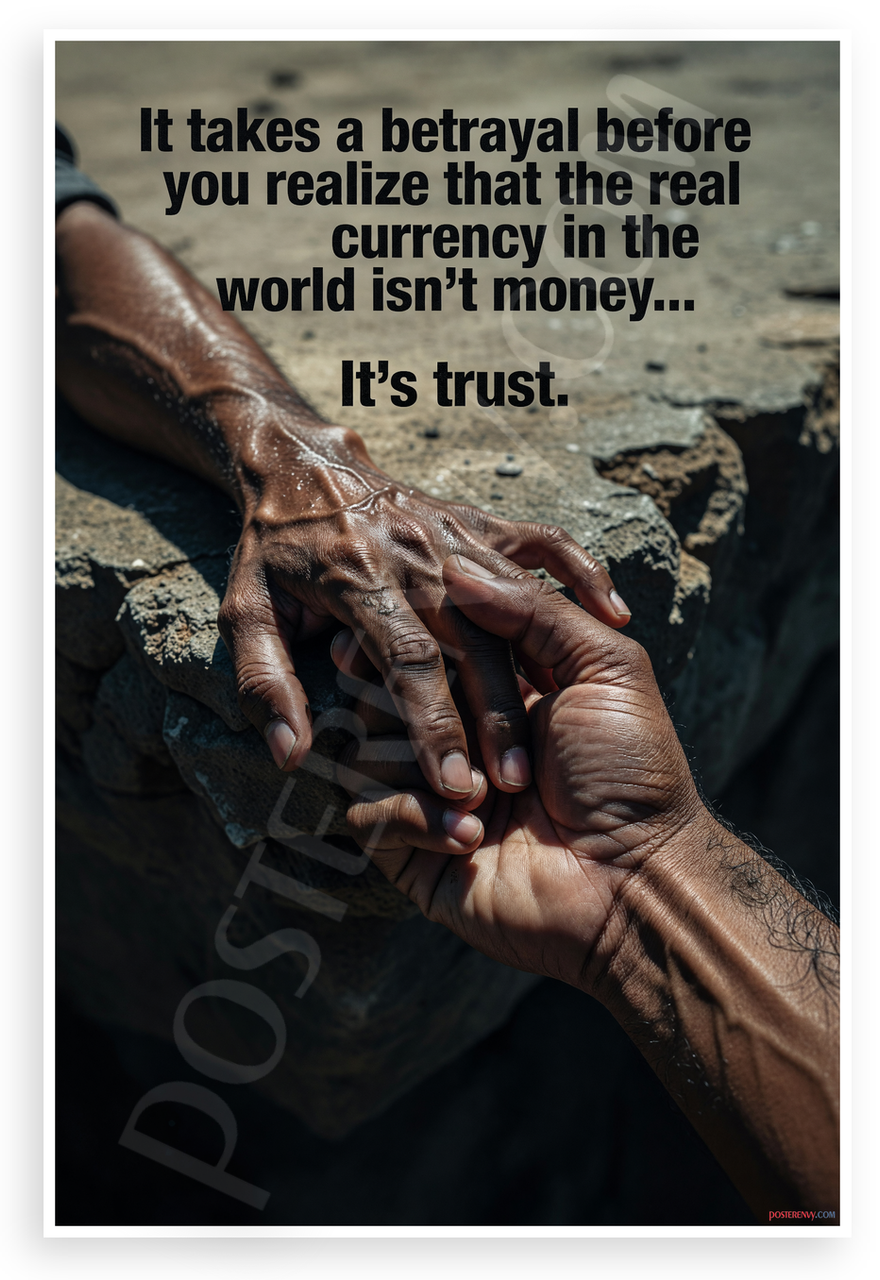 This 12x18 inch poster is printed on premium, durable paper. Proudly Made in the USA by PosterEnvy. The perfect size for any room. PosterEnvy is a family owned business, delivering top-notch posters around the world for over 20 years. Our posters are designed to last — they won't fade or pucker for years of enjoyment. Every poster features crisp, vivid artwork. We are a solar powered company. This striking poster features two muscular hands clasped together over rugged rocks, symbolizing trust amid betrayal, with the powerful quote 'It takes a betrayal before you realize that the real currency in the world isn't money... It's trust.' in bold typography. Ideal for motivational wall decor.