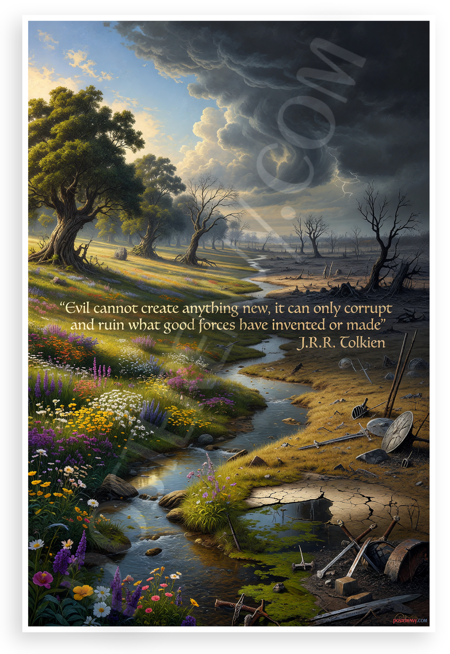 This 12x18 inch poster is printed on premium, durable paper. Proudly Made in the USA by PosterEnvy. The perfect size for any room. PosterEnvy is a family owned business, delivering top-notch posters around the world for over 20 years. Our posters are designed to last — they won't fade or pucker for years of enjoyment. Every poster features crisp, vivid artwork. We are a solar powered company. This striking fantasy landscape depicts a blooming meadow with vibrant flowers and a serene stream transitioning into a barren wasteland scattered with broken swords and shields, under a dramatic sky of storm clouds and lightning, embodying the profound J.R.R. Tolkien quote on evil's corrupting nature.