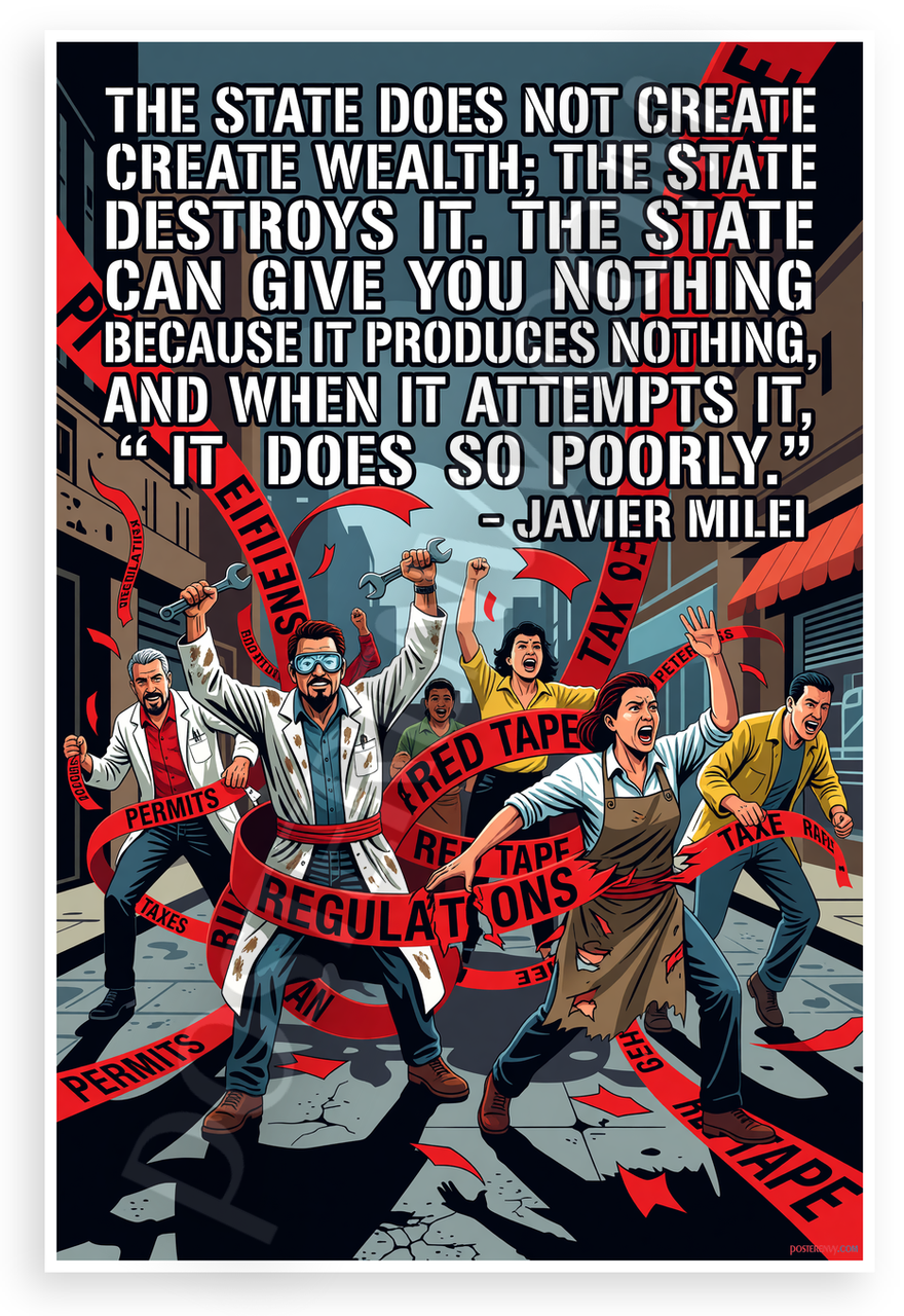 - Premium Print: This PosterEnvy 12x18 inch poster is printed on Durable, Heavy Duty Paper, Designed to last many years. Javier Milei quote on state destroying wealth with red tape bureaucracy imagery