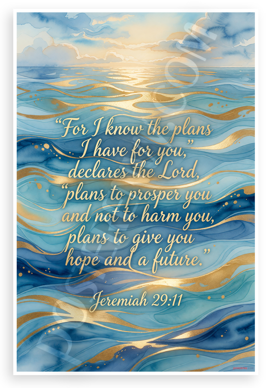- Premium Print: This PosterEnvy 12x18 inch poster is printed on Durable, Heavy Duty Paper, Designed to last many years with Jeremiah 29:11 Bible verse and abstract watercolor ocean waves