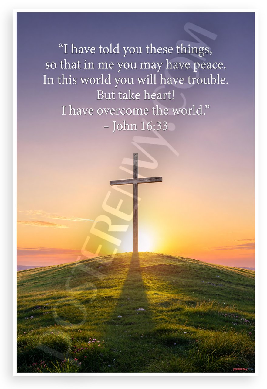 - Premium Print: This PosterEnvy 12x18 inch poster is printed on Durable, Heavy Duty Paper, Designed to last many years with John 16:33 Bible verse, wooden cross sunset scene, Christian inspiration