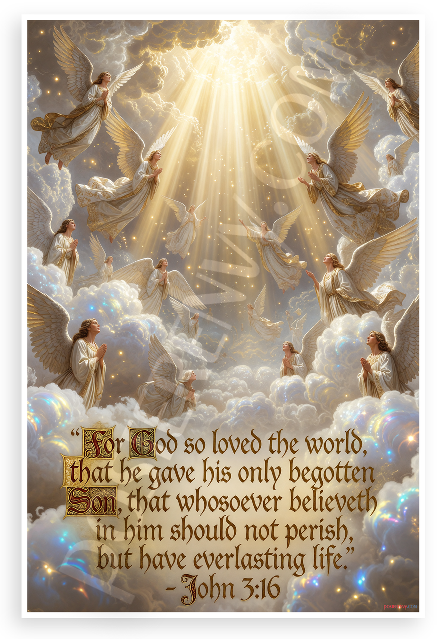 - Heavenly Angels Scene: Ethereal angels in flowing robes pray amid radiant golden beams and clouds, with majestic John 3:16 quote; ideal for prayer rooms, churches, bedrooms