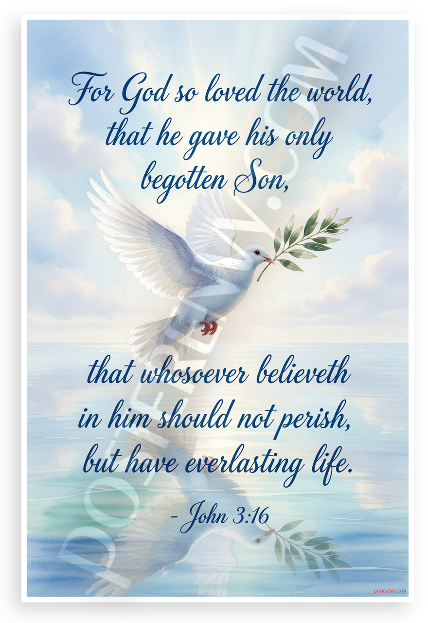 - Premium Print: This PosterEnvy 12x18 inch poster is printed on Durable, Heavy Duty Paper, Designed to last many years with John 3:16 Bible verse, white dove, olive branch watercolor art