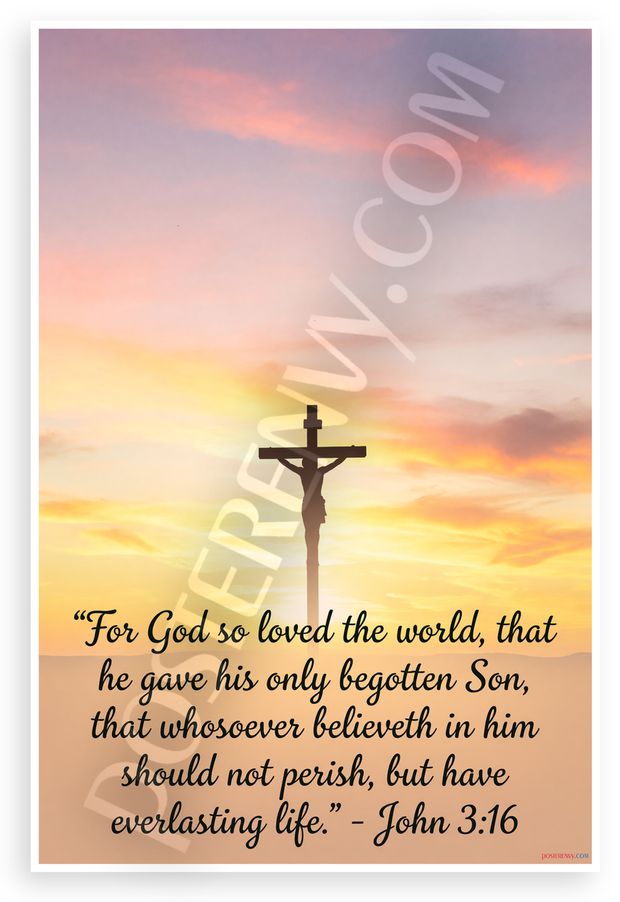- Premium Print: This PosterEnvy 12x18 inch poster is printed on Durable, Heavy Duty Paper, Designed to last many years. Features John 3:16 quote with Jesus cross silhouette against sunset sky