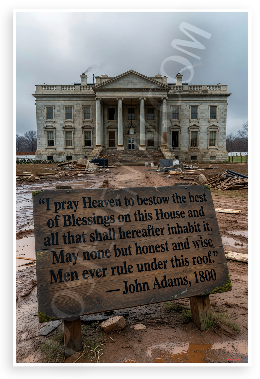 - Historical White House Scene: Depicts the original presidential mansion under construction in muddy conditions with gray skies and Adams quote sign, evoking early American resilience for offices, classrooms or studies