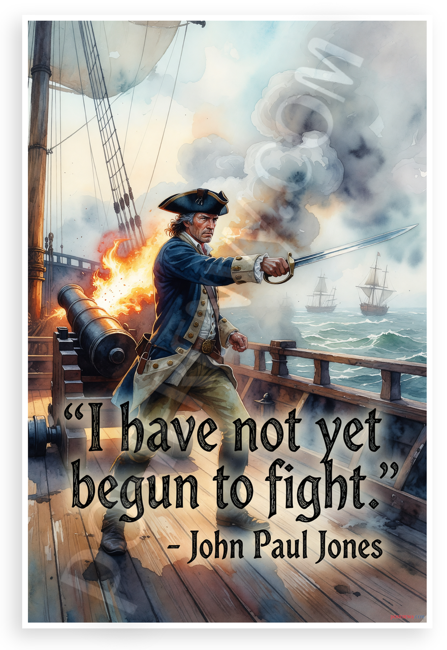 This 12x18 inch poster is printed on premium, durable paper. Proudly Made in the USA by PosterEnvy. The perfect size for any room. PosterEnvy is a family owned business, delivering top-notch posters around the world for over 20 years. Our posters are designed to last — they won't fade or pucker for years of enjoyment. Every poster features crisp, vivid artwork. We are a solar powered company. This dramatic watercolor-style illustration captures John Paul Jones in epic naval battle action aboard a ship, sword raised amid cannon fire and stormy seas. The iconic quote "I have not yet begun to fight!" - John Paul Jones inspires with historical seafaring heroism.