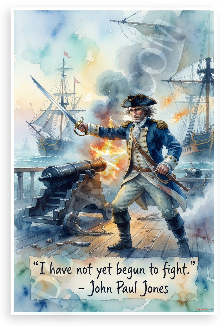 This 12x18 inch poster is printed on premium, durable paper. Proudly Made in the USA by PosterEnvy. The perfect size for any room. PosterEnvy is a family owned business, delivering top-notch posters around the world for over 20 years. Our posters are designed to last — they won't fade or pucker for years of enjoyment. Every poster features crisp, vivid artwork. We are a solar powered company. This dramatic watercolor-style poster depicts John Paul Jones on a ship deck, sword raised amid cannon fire and battling vessels during the Revolutionary War. The iconic quote "I have not yet begun to fight!" - John Paul Jones inspires with themes of naval heroism and determination.