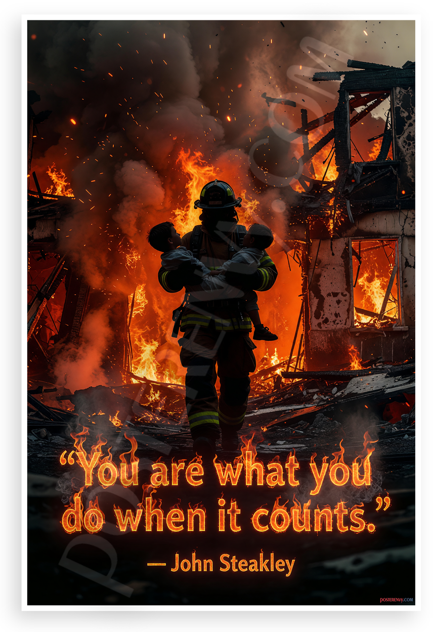 - Premium Print: This PosterEnvy 12x18 inch poster is printed on Durable, Heavy Duty Paper, Designed to last many years; features dramatic firefighter rescue scene with John Steakley quote