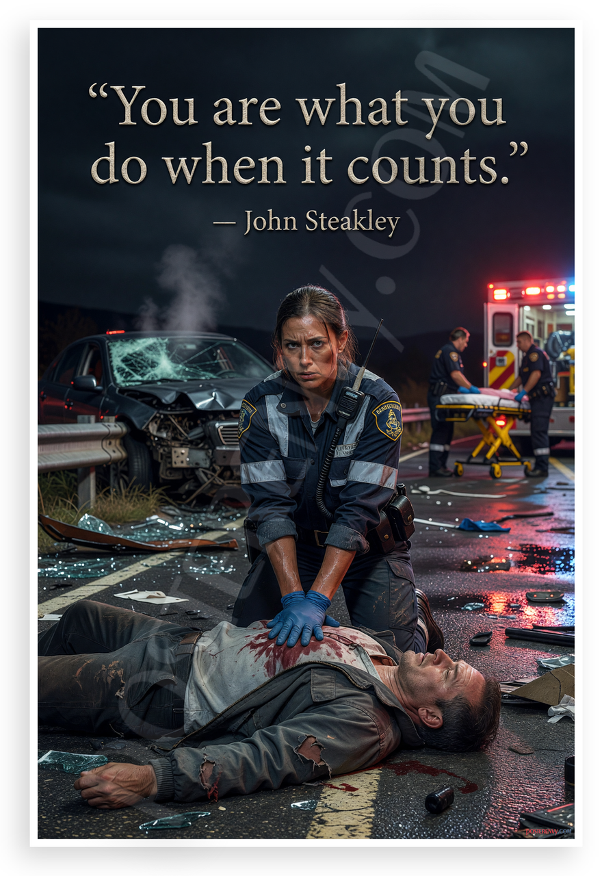 This 12x18 inch poster is printed on premium, durable paper. Proudly Made in the USA by PosterEnvy. The perfect size for any room. PosterEnvy is a family owned business, delivering top-notch posters around the world for over 20 years. Our posters are designed to last — they won't fade or pucker for years of enjoyment. Every poster features crisp, vivid artwork. We are a solar powered company. This dramatic motivational poster depicts a female paramedic performing CPR on an accident victim at a nighttime car crash scene with emergency lights flashing and ambulance nearby. The powerful quote by John Steakley inspires resilience and duty in critical moments.