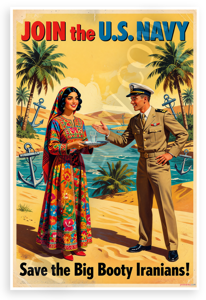 This 12x18 inch poster is printed on premium, durable paper. Proudly Made in the USA by PosterEnvy. The perfect size for any room. PosterEnvy is a family owned business, delivering top-notch posters around the world for over 20 years. Our posters are designed to last — they won't fade or pucker for years of enjoyment. Every poster features crisp, vivid artwork. We are a solar powered company. This vintage-style recruiting poster depicts a Navy officer and Iranian woman in colorful attire on a sunny desert oasis with palm trees, anchors, and waves. Bold text reads 'JOIN the U.S. NAVY' and 'Save the Big Booty Iranians!' in a patriotic 1940s travel poster vibe.